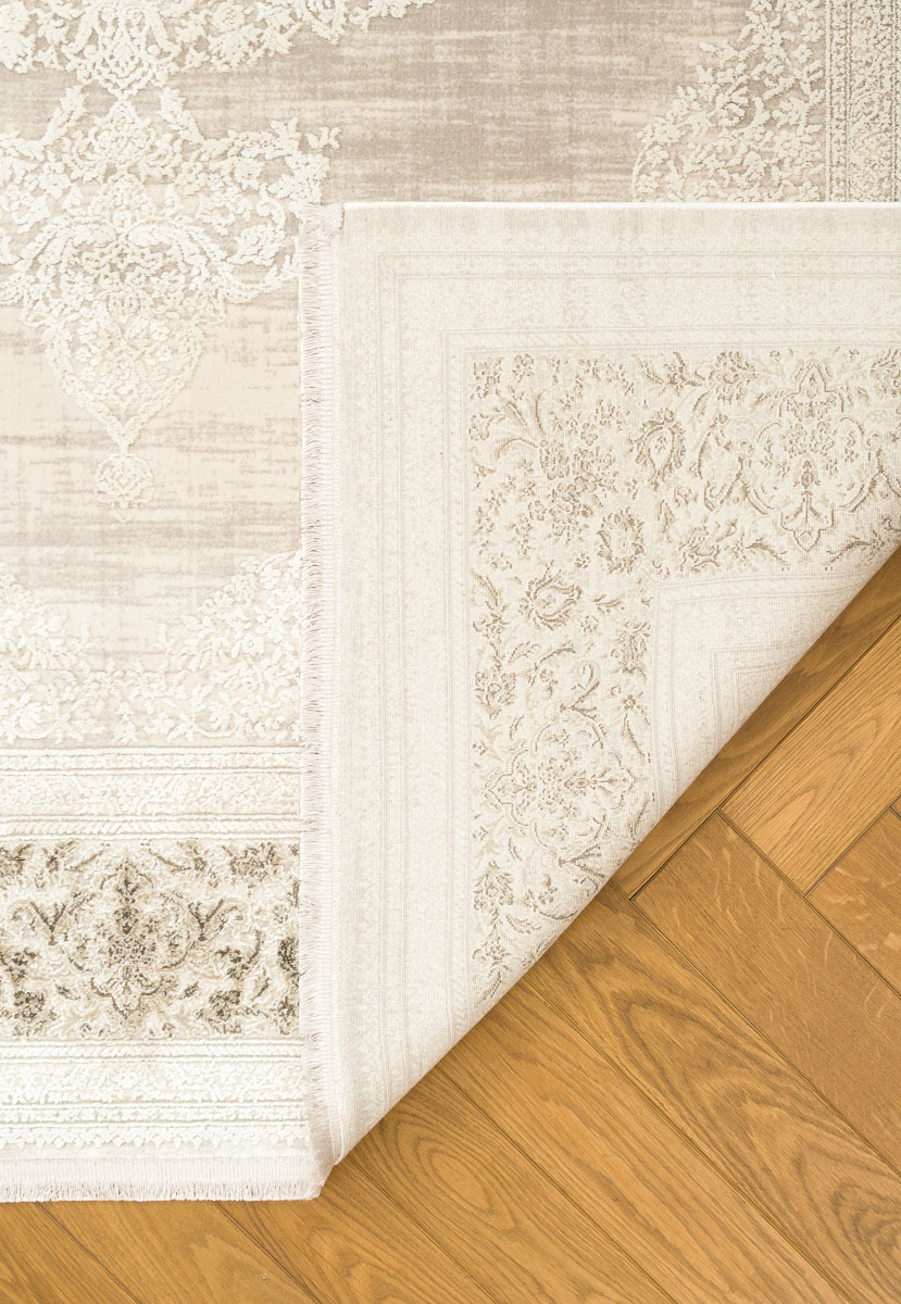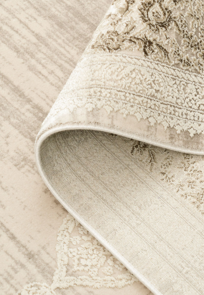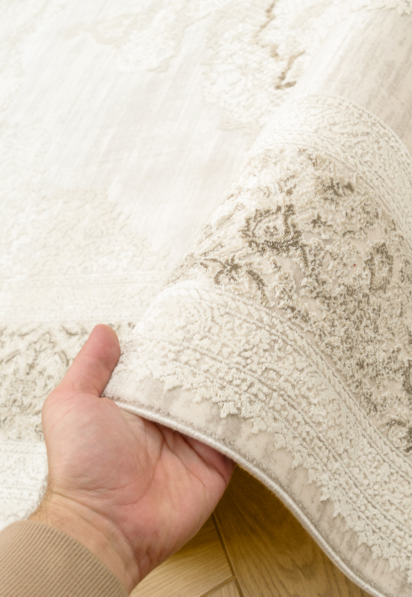Ворс ковров изготовлен из смеси акрила и полиэстера, удачно объединяя их лучшие свойства. Мягкость и приятный блеск синтетических волокон дарят положительные тактильные ощущения и радуют глаз переливами на свету. Высокая плотность плетения — 1,6 млн точек/м² — обеспечивает впечатляющую долговечность и износостойкость, а небольшая высота ворса (7 мм) делает уборку простой и удобной. Это достойное украшение гостиной или спальни на многие годы.