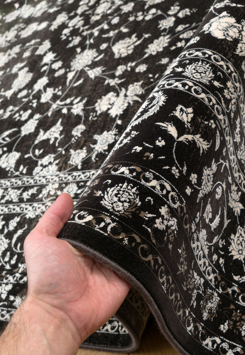 Мягкий, шелковистый ворс из сочетания вискозы и акрила обладает особой притягательностью, вызывая самые приятные тактильные ощущения от прикосновений. Его волшебные переливы создают ощущения движения и завораживают игрой света по поверхности. В зависимости от угла обзора рисунок и оттенок ковра воспринимаются по-разному: против ворса узор выглядит более чётким и насыщенным, по ворсу — светлым и приглушённым.