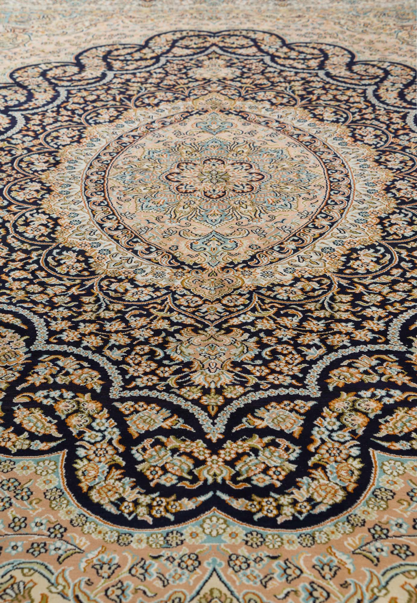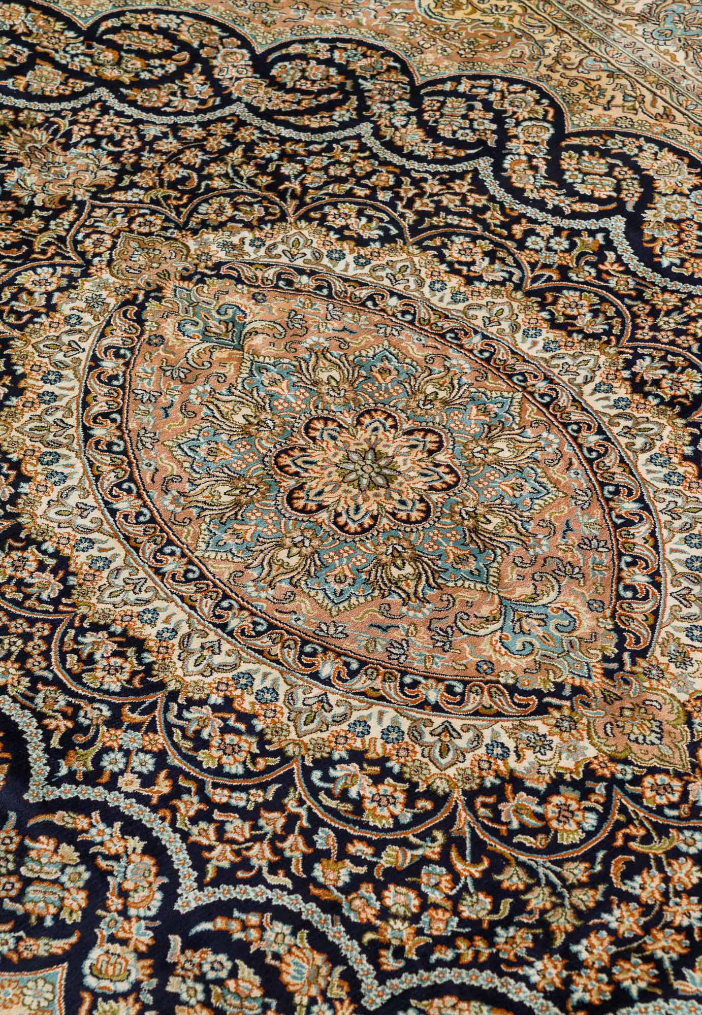 Особая техника плетения и тонкость шёлковой нити позволяют добиться высшей узелковой плотности (более 500 000 точек/м2), благодаря чему мастера могут создавать неповторимые, редкие дизайны с тонким рисунком. Шелковые ковры Cashmir от одноименного бренда поражают благородными сочетаниями красок и мягким сиянием нити.