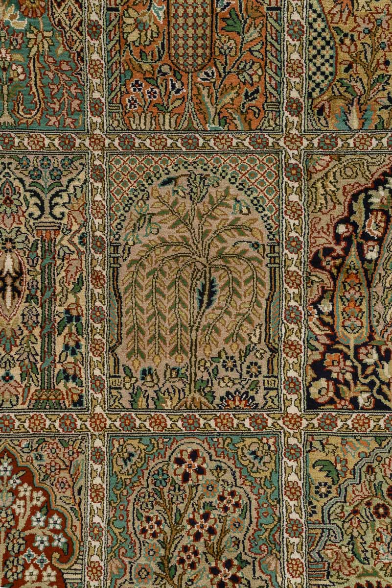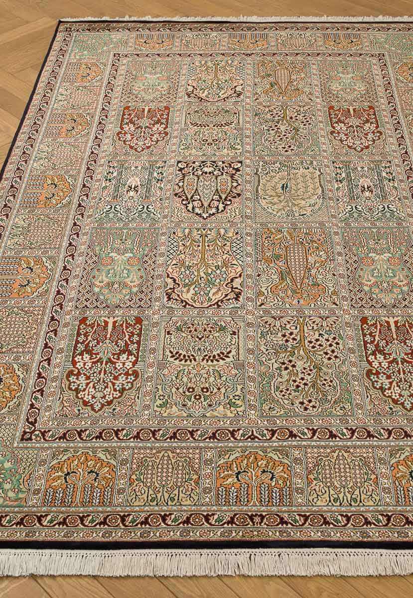 Особая техника плетения и тонкость шёлковой нити позволяют добиться высшей узелковой плотности (более 500 000 точек/м2), благодаря чему мастера могут создавать неповторимые, редкие дизайны с тонким рисунком. Шелковые ковры Cashmir от одноименного бренда поражают благородными сочетаниями красок и мягким сиянием нити.