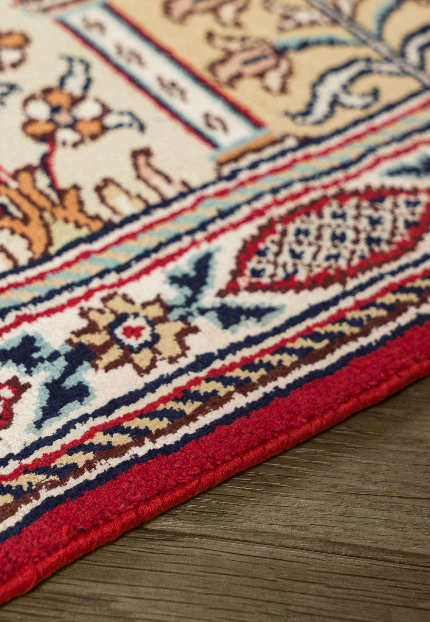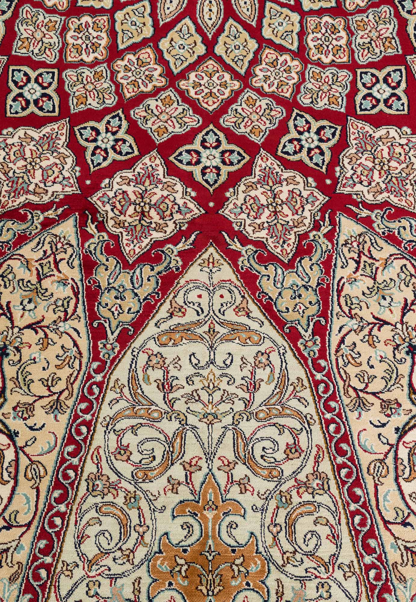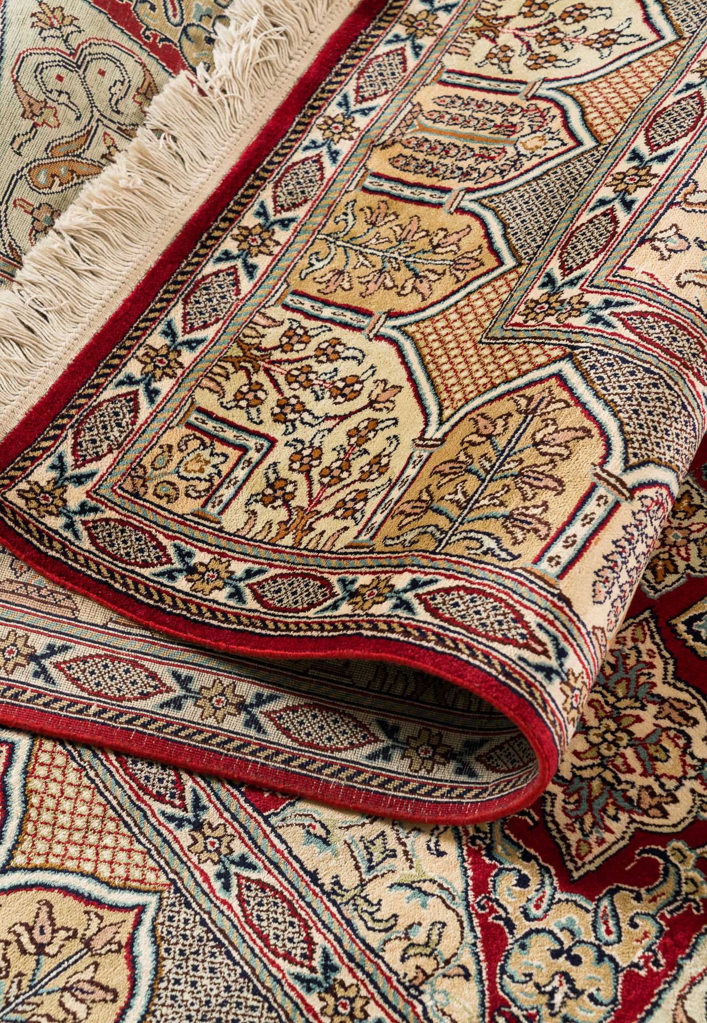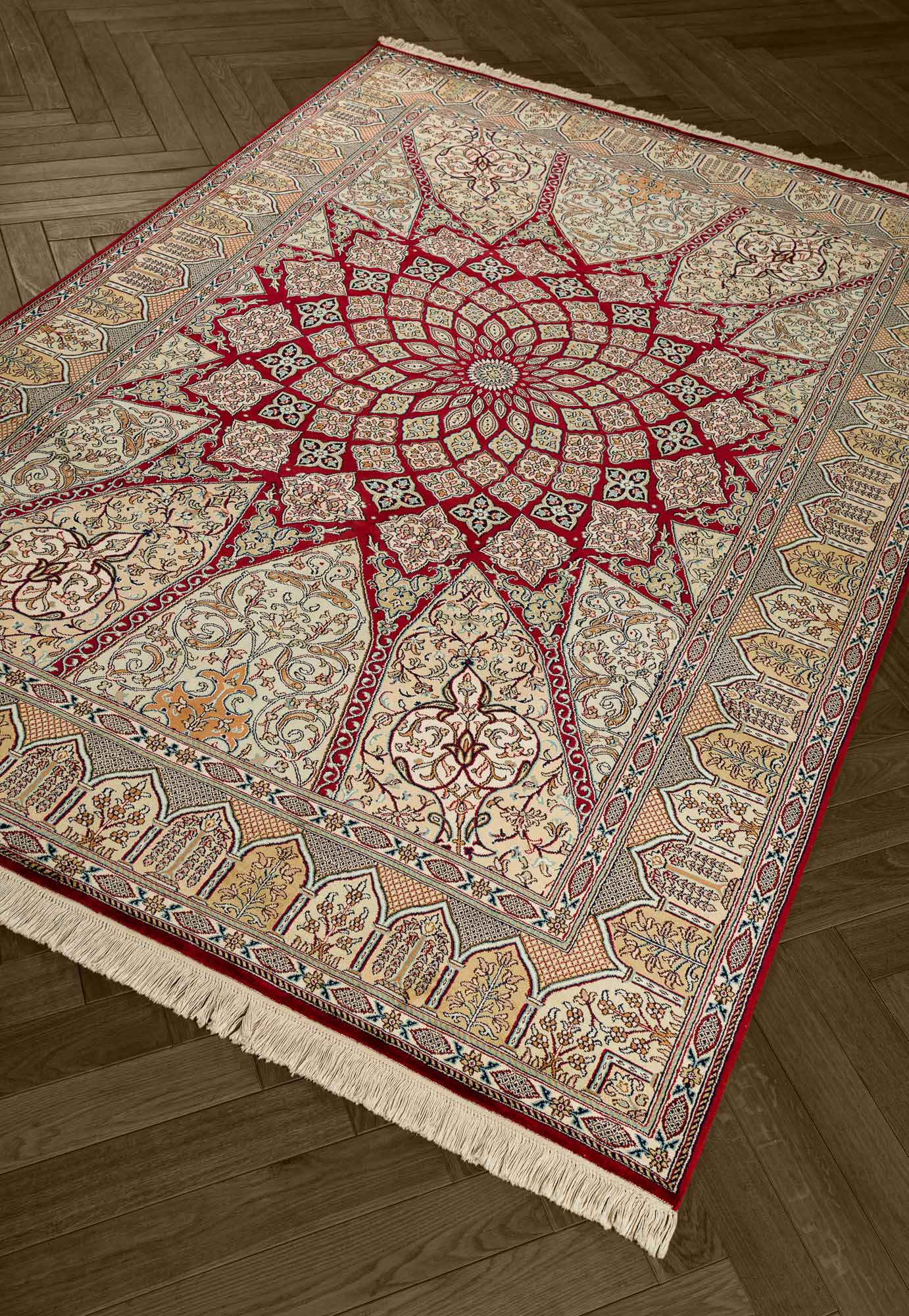 Особая техника плетения и тонкость шёлковой нити позволяют добиться высшей узелковой плотности (более 500 000 точек/м2), благодаря чему мастера могут создавать неповторимые, редкие дизайны с тонким рисунком. Шелковые ковры Cashmir от одноименного бренда поражают благородными сочетаниями красок и мягким сиянием нити.
