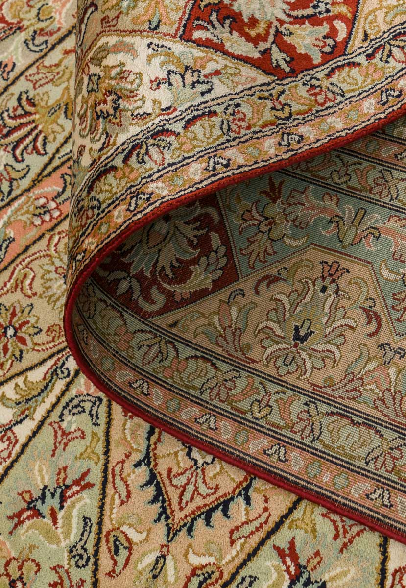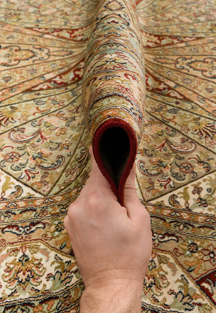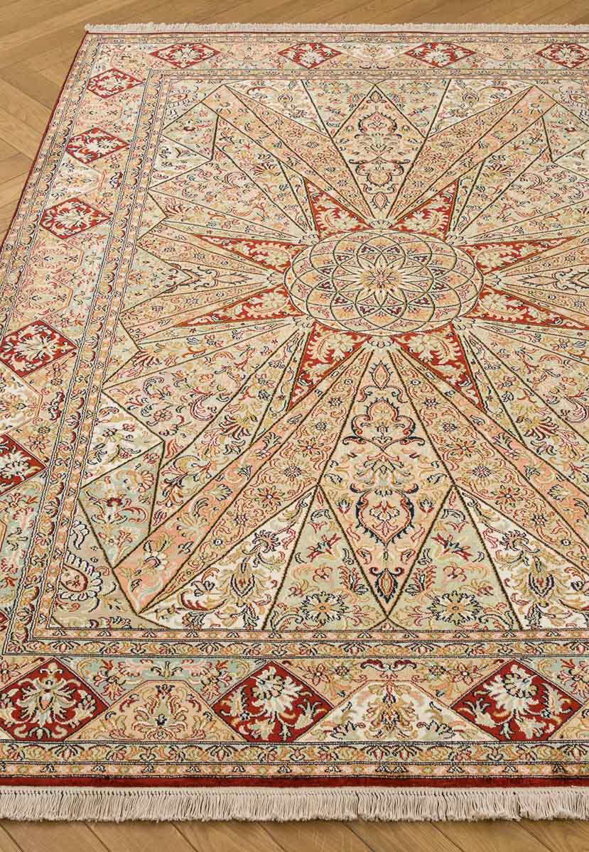 Особая техника плетения и тонкость шёлковой нити позволяют добиться высшей узелковой плотности (более 500 000 точек/м2), благодаря чему мастера могут создавать неповторимые, редкие дизайны с тонким рисунком. Шелковые ковры Cashmir от одноименного бренда поражают благородными сочетаниями красок и мягким сиянием нити.