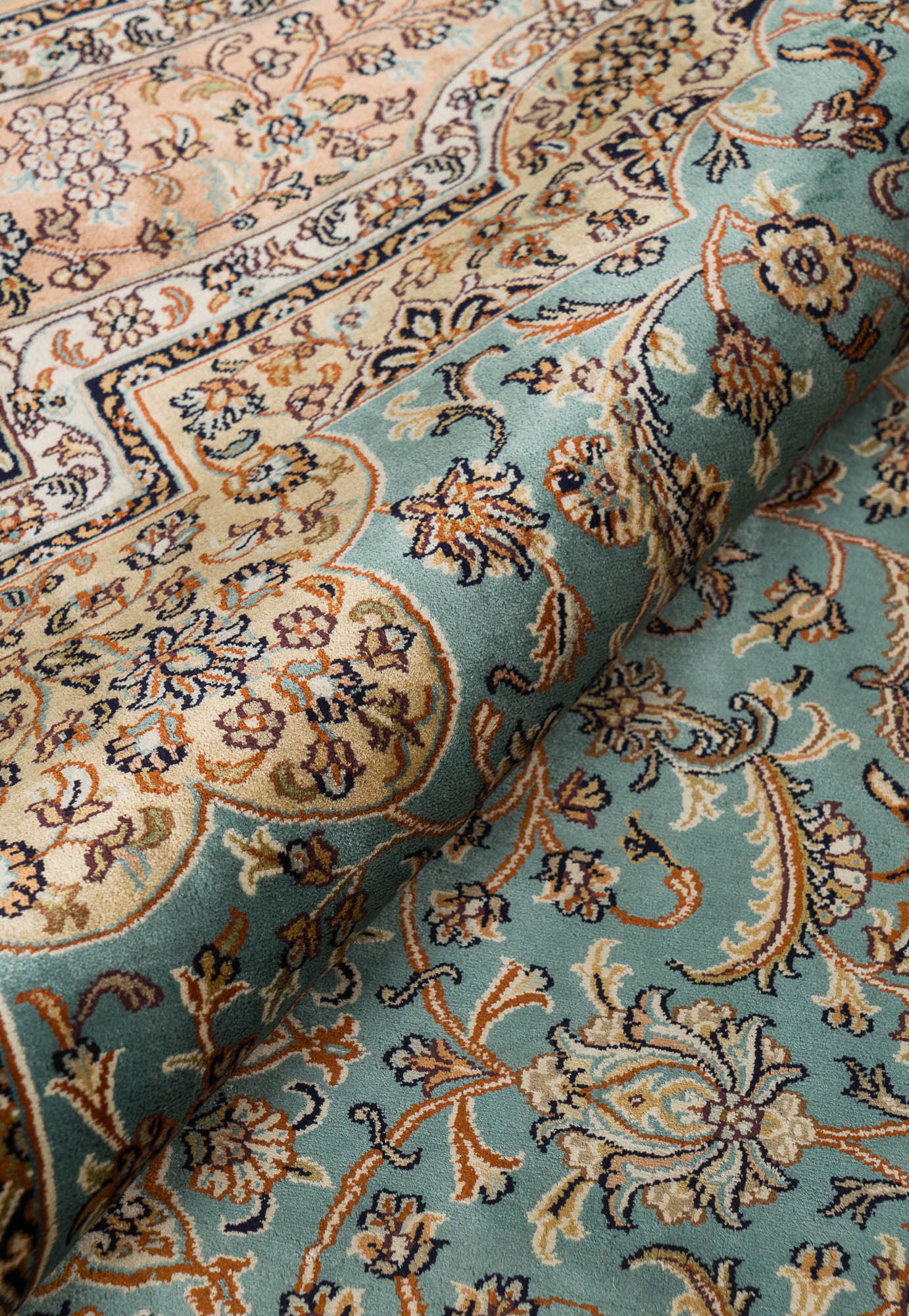 Особая техника плетения и тонкость шёлковой нити позволяют добиться высшей узелковой плотности (более 500 000 точек/м2), благодаря чему мастера могут создавать неповторимые, редкие дизайны с тонким рисунком. Шелковые ковры Cashmir от одноименного бренда поражают благородными сочетаниями красок и мягким сиянием нити.