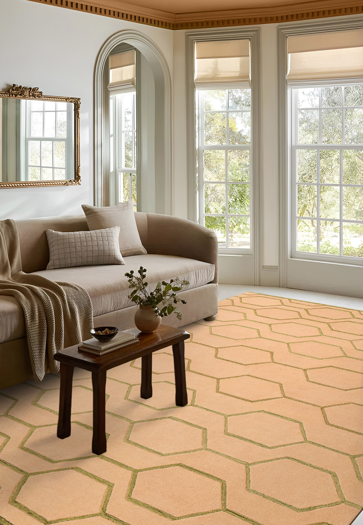 Роскошное полотно из отборной натуральной шерсти предстаёт в нежных оттенках персикового цвета. Оно служит идеальным фоном для изысканных геометрических мотивов из нежнейшей вискозы. Благородное сияние её шелковистых нитей украшает поверхность ковра, даря ему неповторимый шарм и очарование при любом освещении.