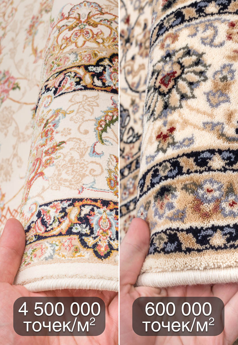 Рекордно большая плотность плетения ворса – 4,5 млн.точек/м2 – удивляет не меньше. Такие высокоплотные ковры, изготовленные из полиэстера и акрила, отлично держат форму и очень медленно изнашиваются. А качество и детализация рисунка на невысоком ворсе (5 мм) достойны отдельного внимания. Отличный выбор для украшения гостиной или спальни!