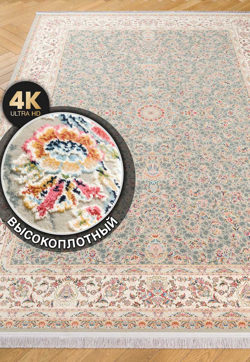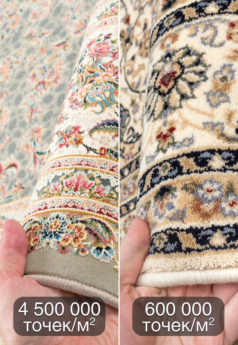 Рекордно большая плотность плетения ворса – 4,5 млн.точек/м2 – удивляет не меньше. Такие высокоплотные ковры, изготовленные из полиэстера и акрила, отлично держат форму и очень медленно изнашиваются. А качество и детализация рисунка на невысоком ворсе (5 мм) достойны отдельного внимания. Отличный выбор для украшения гостиной или спальни!