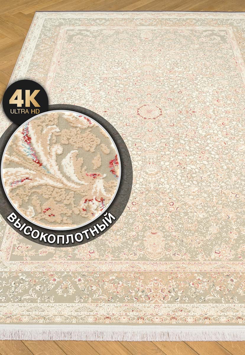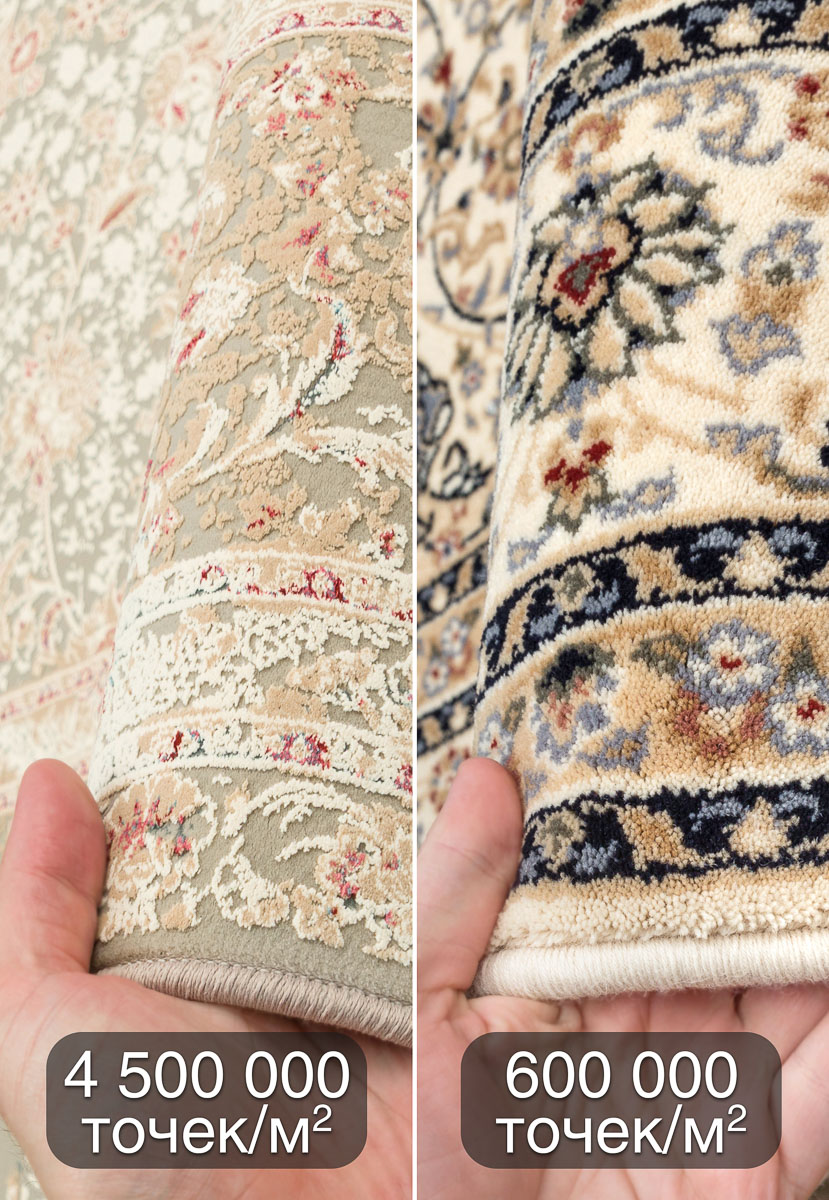 Рекордно большая плотность плетения ворса – 4,5 млн.точек/м2 – удивляет не меньше. Такие высокоплотные ковры, изготовленные из полиэстера и акрила, отлично держат форму и очень медленно изнашиваются. А качество и детализация рисунка на невысоком ворсе (5 мм) достойны отдельного внимания. Отличный выбор для украшения гостиной или спальни!