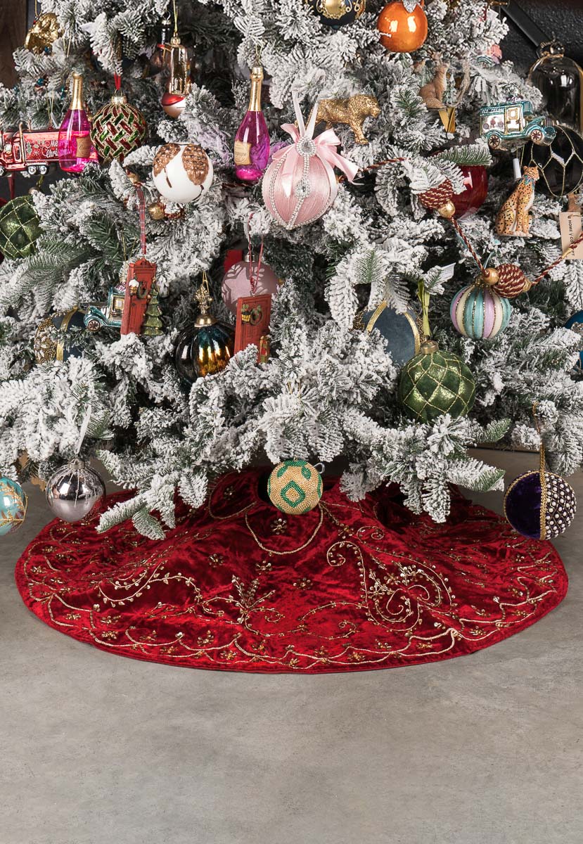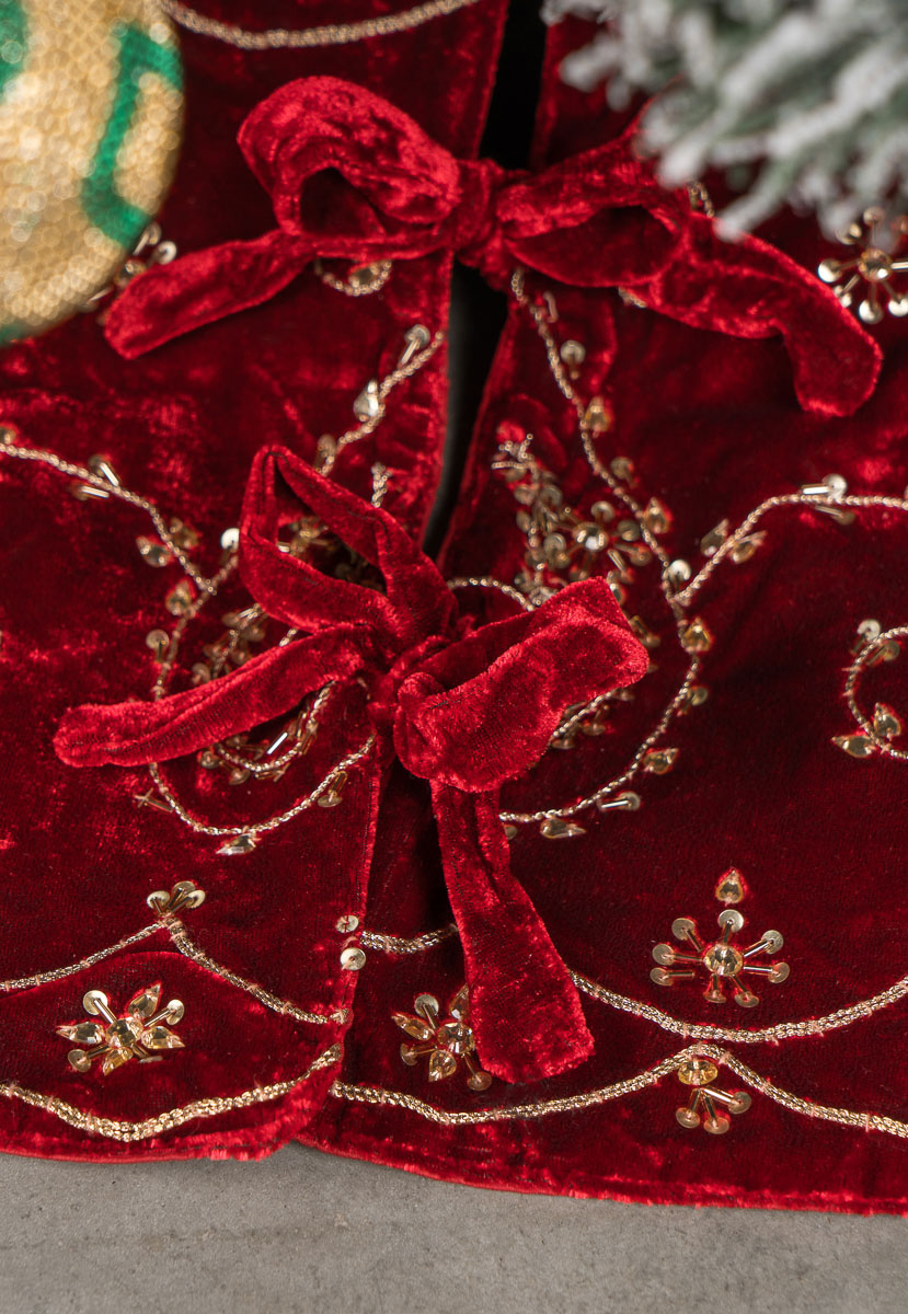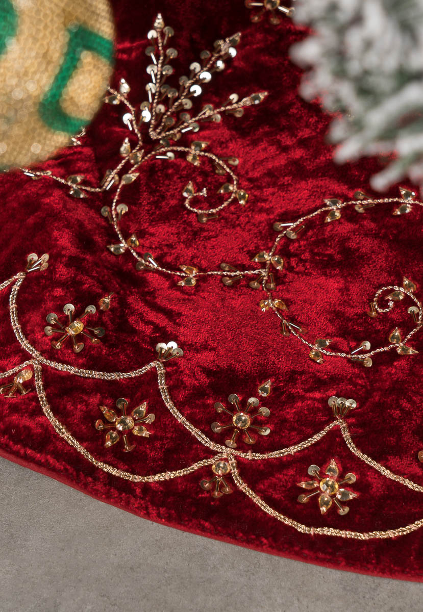 Универсальная ёлочная юбка выполнена из высококачественной ткани бордового цвета с золотистым узором. За счёт круглой формы, разреза под ствол и завязок коврик не будет пузыриться по краям и станет эффектным украшением для низа ёлки.
