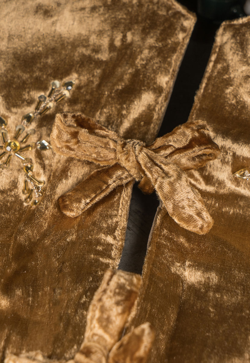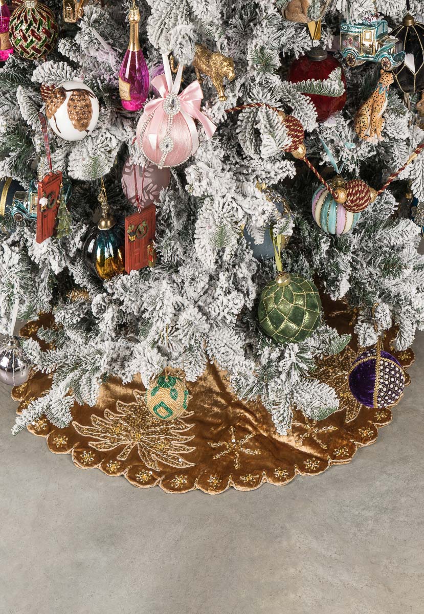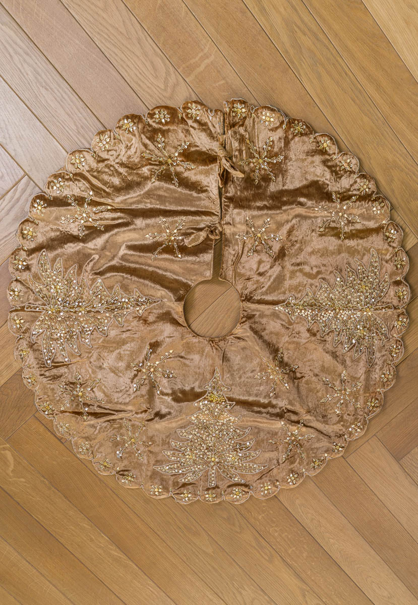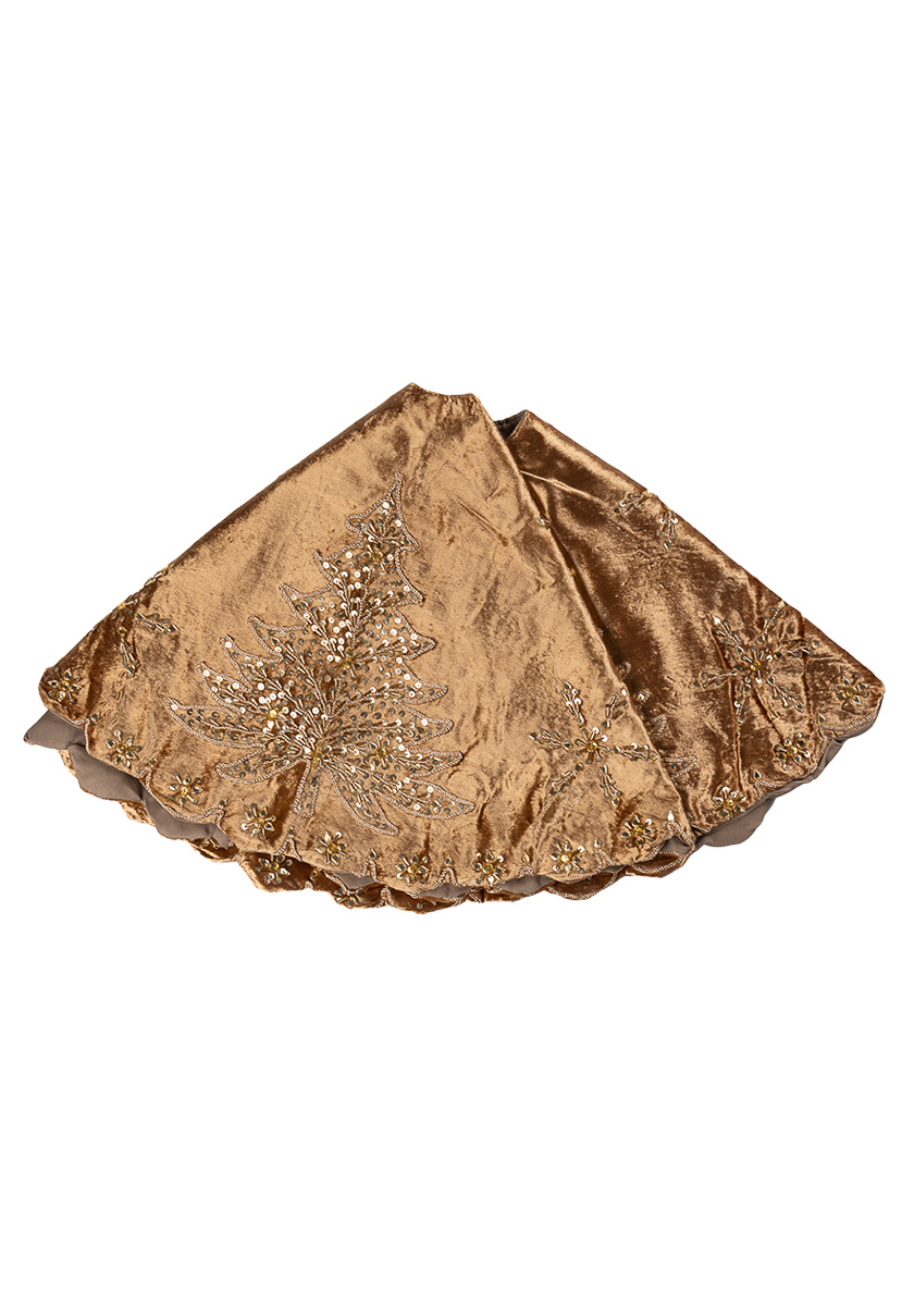 Универсальная ёлочная юбка выполнена из высококачественной ткани бронзового цвета с золотистым узором. За счёт круглой формы, разреза под ствол и завязок коврик не будет пузыриться по краям и станет эффектным украшением для низа ёлки.